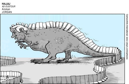 “نيويورك تايمز” تصور الحكومة الإسرائيلية بصورة ديناصور يستخدم الجدر العازلة لتحميه من انقراض وشيك: