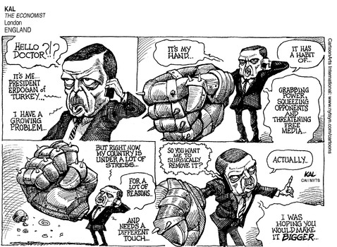 وتناولت “نيورك تايمز” تعامل الرئيس التركي أردوغان، الخاطئ مع مشاكل بلده في رسم يشتكي فيه لطبيبه من قبضته القوية: