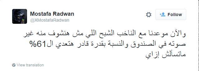وقال المغرد مصطفى رضوان: “والآن موعدنا مع الناخب الشبح اللي مش هنشوف منه غير صوته في الصندوق والنسبة بقدرة قادر هتعدي الـ61% ماتسألش إزاي”.