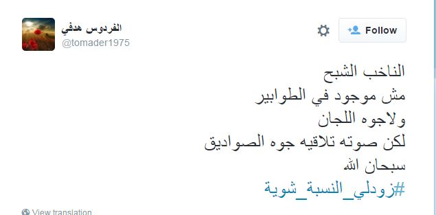 وقال tomader1975: “الناخب الشبح مش موجود في الطوابير ولا جوه اللجان، لكن صوته تلاقيه جوه الصواديق، سبحان الله#زودلي_النسبة_شوية”.