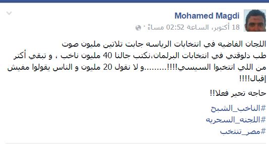 كما علق محمد مجدي، عبر “فيس بوك”، قائلا: “اللجان الفاضيه في انتخابات الرياسه جابت تلاتين مليون صوت، طب دلوقتي في انتخابات البرلمان،نكتب جالنا 40 مليون ناخب ، و تبقي أكتر من اللي انتخبوا السيسي!!!!………و لا نقول 20 مليون و الناس يقولوا مفيش إقبال!!!! حاجه تحير فعلا!!”.