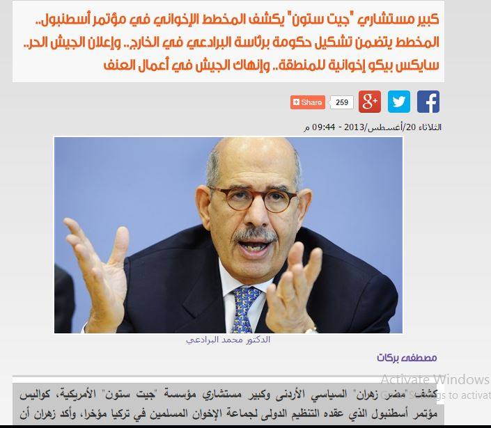 إذ نشرت صحيفة “فيتو” الممولة من رجل الأعمال المصري نجيب ساويرس، بتاريخ 20-8-2013 تقريرا خبريا، جاءت عناوينه كالتالي: “كبير مستشاري “جيت ستون” يكشف المخطط الإخواني في مؤتمر إسطنبول.. المخطط يتضمن تشكيل حكومة برئاسة البرادعي في الخارج.. وإعلان الجيش الحر.. سايكس بيكو إخوانية للمنطقة.. وإنهاك الجيش في أعمال العنف”.