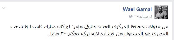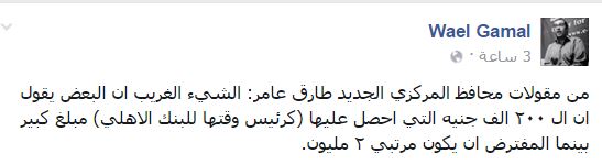 وشن وائل جمال، الكاتب الصحفي المتخصص في الشؤون الاقتصادية، هجومًا على “عامر”، وذكر له عدة تصريحات منها: “لو كان مبارك فاسدا فالشعب المصري هو المسؤول عن فساده لأنه تركه يحكم ٣٠ عامًا”، وتصريح آخر: “الشيء الغريب أن البعض يقول إن الـ٢٠٠ ألف جنيه التي حصل عليها (رئيس البنك الأهلي وقتها) مبلغ كبير بينما المفترض ان يكون مرتبي ٢ مليون“.