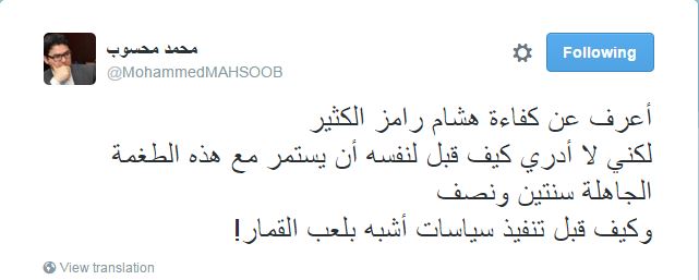 وعلق الدكتور محمد محسوب، وزير الدولة للشؤون القانونية والمجالس النيابية السابق، قائلاً: “أعرف عن كفاءة هشام رامز الكثير لكنني لا أدري كيف قبل لنفسه أن يستمر مع هذه الطغمة الجاهلة سنتين ونصفًا، وكيف قبل تنفيذ سياسات أشبه بلعب القمار!”.
