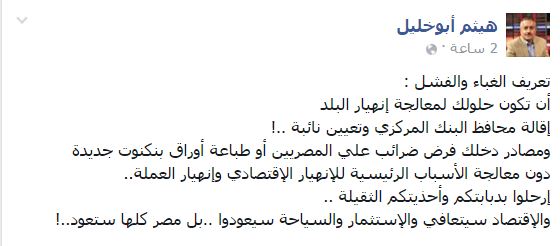 إقالة محافظ البنك المركزي وتعيين نائبه، ومصادر دخلك فرض ضرائب على المصريين أو طباعة أوراق بنكنوت جديدة، دون معالجة الأسباب الرئيسية للانهيار الاقتصادي وانهيار العملة”.