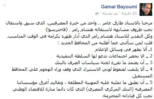 رحب مساعد وزير الخارجية الأسبق، السفير جمال بيومي بطارق عامر؛ باعتباره “أحد خيرة المصرفيين، الذي سبق واستقال تحت ظروف مشابهة لاستقالة هشام رامز”، محذرًا: “احترسوا”.