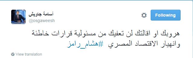 وقال الإعلامي أسامة جاويش، موجهًا حديثه لهشام رامز: “هروبك أو إقالتك لن تعفيك من مسؤولية قرارات خاطئة وانهيار الاقتصاد المصري”.
