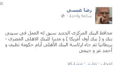 وأشار رضا عيسى، الخبير الاقتصادي، إلى أن محافظ البنك المركزي الجديد، سبق له العمل في سيتى بنك و(بنك أوف أميركا) ومديرًا للبنك الأهلي المصري في بريطانيا، ثم جاء لرئاسة البنك الأهلي أيام حكومة نظيف وأحمد عز وجمال مبارك.
