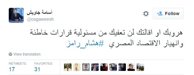 دشن عدد من رواد مواقع التواصل الاجتماعي هاشتاجا باسم “هشام رامز”، بعد استقالته من منصب محافظ البنك المركزي، وتعيين طارق عامر رئيس البنك الأهلي السابق، في منصبه بقرار من عبد الفتاح السيسي.