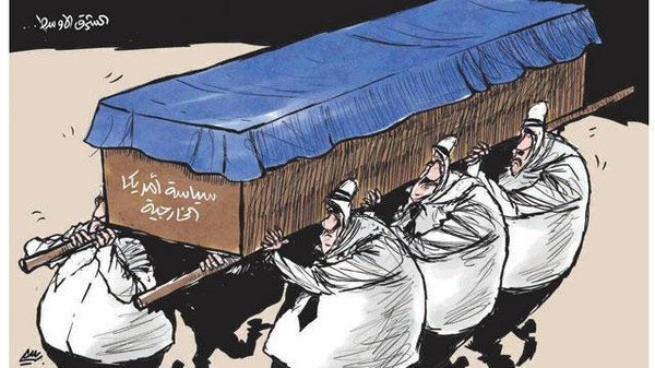 أما “العربية” فقد نشرت رسما يعبر عن تشييع الشرق الأوسط جثمان السياسة الأميركية الخارجية.