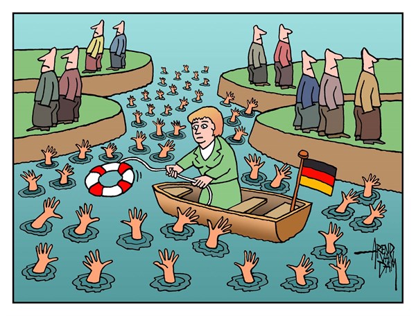 ونشرت أيضا “بوليتكال كارتونز” هذا الرسم الذي يوضح مجهودات أنجيلا ميركل في شؤون اللاجئين وسط تجاهل العالم لهم.