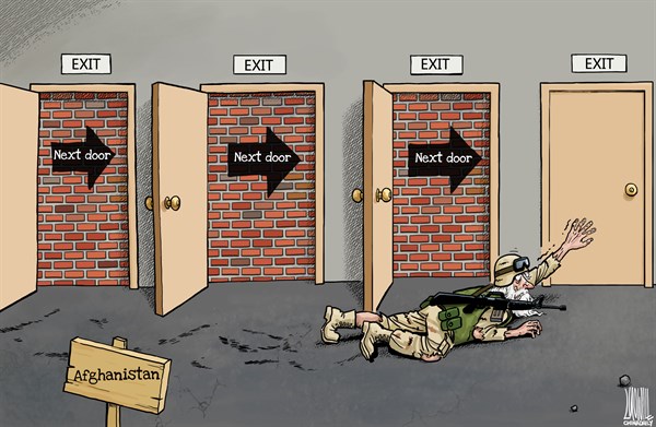 وأيضا جاء كاريكاتير موقع “كاجل” معبرا عن الوضع الأميركي في أفغانستان.