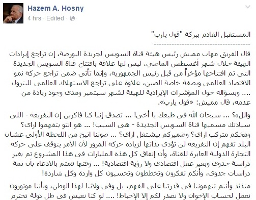 وتحت عنوان “المستقبل القادم ببركة قول يا رب”، كتب “حازم” منشورًا عبر صفحته الرسمية على موقع “فيس بوك” جاء فيها: “قال الفريق مهاب مميش رئيس هيئة قناة السويس، لجريدة البورصة، إن تراجع إيرادات الهيئة خلال شهر أغسطس الماضي، ليس لها علاقة بافتتاح قناة السويس الجديدة التي تم افتتاحها مؤخرا من قبل رئيس الجمهورية، وإنما تأتي ضمن تراجع حركة نمو الاقتصاد العالمي وبصفة خاصة الصين، علاوة على تراجع الاستهلاك العالمي للبترول”.