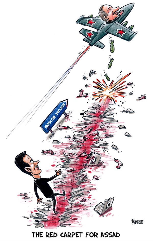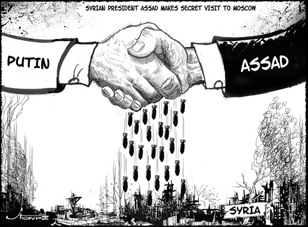 وجاء كاريكاتير “بوليتكال كارتونز” ليشير إلى بوتين وهو يجهز السجادة الحمراء ترحيبا ببشار في موسكو، حيث يشير لونها إلى دماء ضحاياه هو وبشار من المدنيين السوريين: