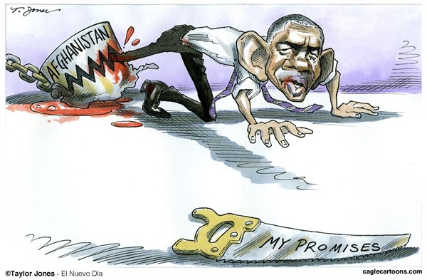 وفي الشأن الأميركي فنشرت “بوليتكال كارتونز” مصيدة أفغانستان التي لن يتمكن أوباما من تنفيذ وعوده فيها إلا بالبتر: