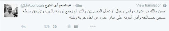 كتب أبو الفتوح، عبر حسابه الرسمى على موقع  “تويتر” “حسن مالك من أشرف وأنقى رجال الأعمال المصريين والذى لم يجمع ثروته بالنهب ولا بنفاق سلطة.. ضحى بمصالحه وأمن أسرته على مدار عمره من أجل حرية وطنه”.