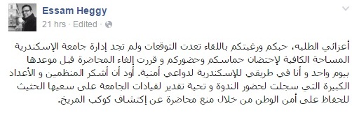 وكتب حجي، خلال تدوينة له على موقع التواصل الاجتماعي “فيسبوك”: “أعزائي الطلبة، حبكم ورغبتكم باللقاء تعدت التوقعات، ولم تجد إدارة جامعة الإسكندرية المساحة الكافية لاحتضان حماسكم وحضوركم، وقررت إلغاء المحاضرة قبل موعدها بيوم واحد، وأنا في طريقي للإسكندرية لدواع أمنية”.