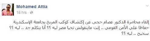 وقال الفنان محمد عطية: “إلغاء محاضرة الدكتور عصام حجي عن اكتشاف كوكب المريخ بجامعة الإسكندرية حفاظا على الأمن القومي.. إنت مابتقولش تحيا مصر ليه؟ أنا باتكلم جد.. ليه؟ سحيح.. ليه؟”.