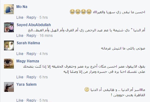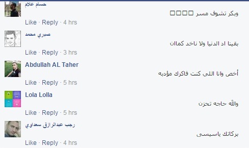 وقال باسم جويش: “اتفضحنا فضيحة الأمم”، أما حسام علام فقال: “وبكرة تشوفوا مسر”، وشاركه الرأي رجب عبد الرازق الذي قال: “بركاتك يا سيسي”.