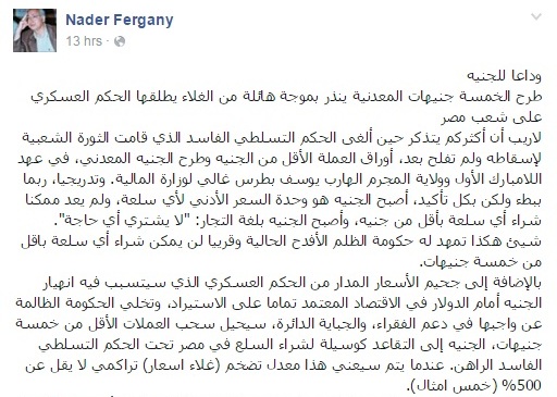 وتحت عنوان “وداعا للجنيه” كتب فرجاني منشورا عبر صفحته الرسمية على موقع “فيس بوك” قال فيه: “طرح الخمسة جنيهات المعدنية ينذر بموجة هائلة من الغلاء يطلقها الحكم العسكري على شعب مصر”.