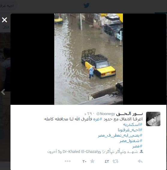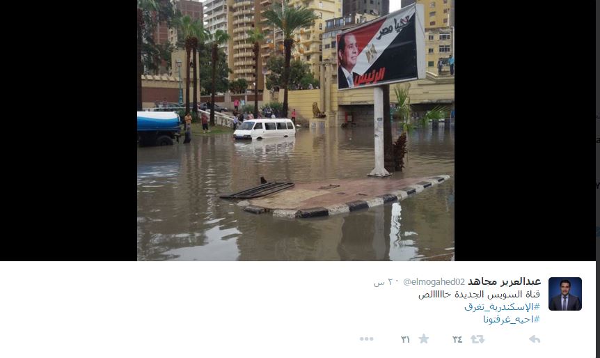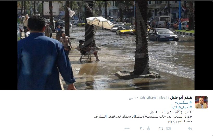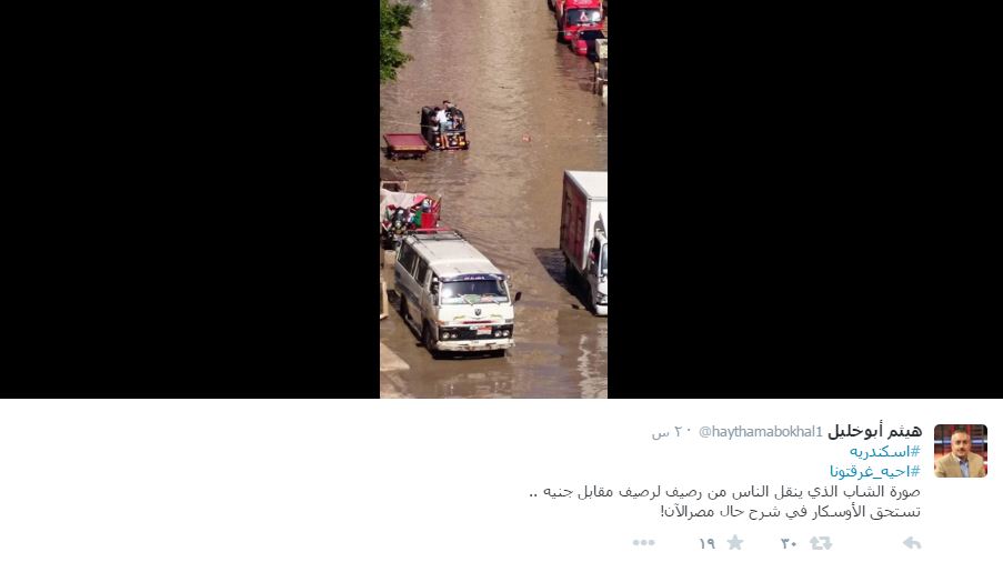 ودشن مغردون عده هاشتاجات كان أبرزها “أحيه غرقتونا” و”إسكندرية بتغرق”، نشروا خلالها صورا كشفت تهالك البنية التحتية للمحافظة.