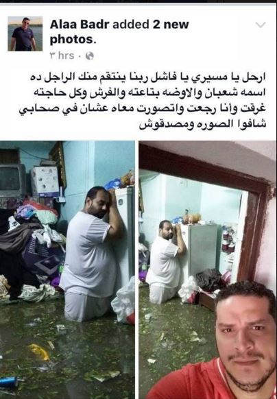 ونشر علاء بدر صورة لشخص غرقت غرفته في مياه الأمطار، معلقا: “ارحل يا مسيري يا فاشل، ربنا ينتقم منك، الراجل ده اسمه شعبان والاوضة بتاعته والفرش وكل حاجته غرقت وانا رجعت واتصورت معاه عشان في صحابي شافوا الصوة ومصدقوش”.