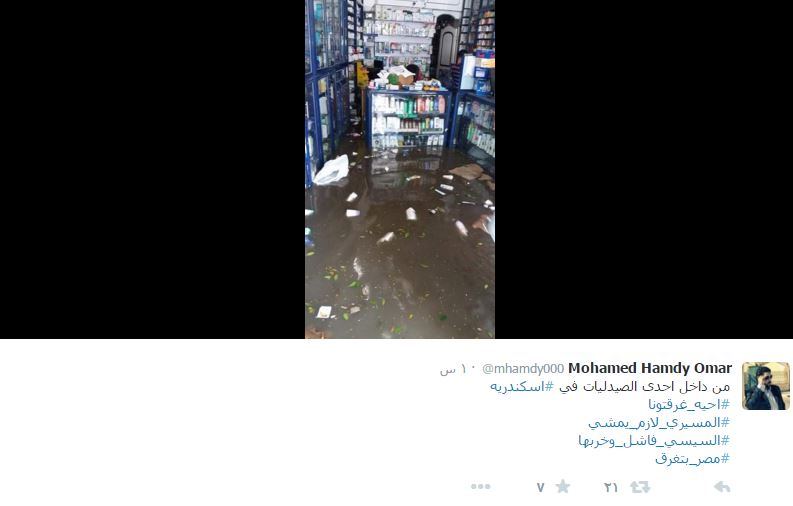 ونشر Mohamed Hamdy Omar صورة من داخل إحدى الصيدليات في الإسكندرية، وهي تغرق في مياه الأمطار”.