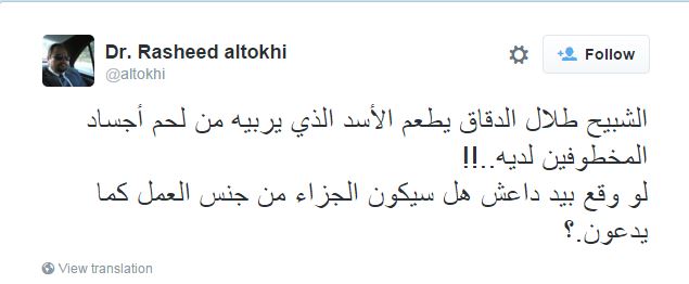 وعلق Dr. Rasheed altokhi قائلاً: “الشبيح طلال الدقاق يطعم الأسد الذي يربيه من لحم أجساد المخطوفين لديه..!!، لو وقع بيد داعش هل سيكون الجزاء من جنس العمل كما يدعون؟”.