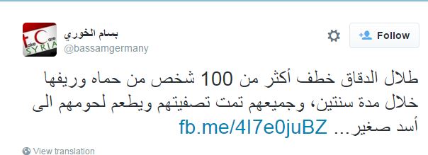 وقال بسام الخوري: “طلال الدقاق خطف أكثر من 100 شخص من حماه وريفها خلال مدة سنتين، وجميعهم تمت تصفيتهم ويطعم لحومهم إلى أسد صغير”.