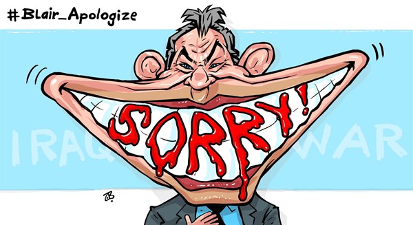 كما سخر موقع كاجل من اعتذار بلير عن غزو العراق بهذا الرسم: