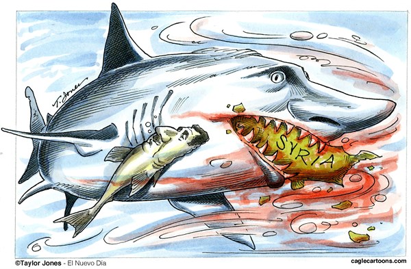 كما صور الرئيس الروسي فلاديمير بوتن بالقرش الذي يلتهم سوريا بعد تدخله بالقوات والسلاح لصالح حليفه بشار الأسد: