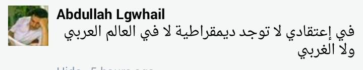 وقال عبد الله لغويل: “في اعتقادي لا توجد ديمقراطية لا في العالم العربي ولا الغربي”.