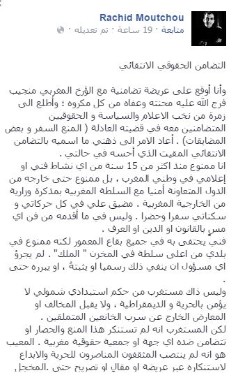 وأعرب عن دهشته من منعه وحصاره، ورغم ذلك لم تتضامن معه أي جهة أو جمعية حقوقية مغربية، أوالمثقفون بالمغرب والمناصرون للحرية والإبداع لاستنكاره عبر عريضة أو مقالٍ أو تصريحٍ.