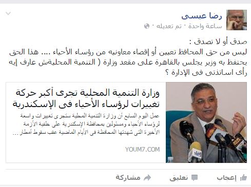 وقال ساخرًا -عبر منشور له على “فيس بوك”-: “صدق أو لا تصدق، ليس من حق المحافظ تعيين أو إقصاء معاونيه من رؤساء الأحياء، هذا الحق يحتفظ به وزير يجلس بالقاهرة على مقعد وزارة التنمية المحلية”.