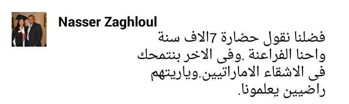 وقال أيضا ناصر زغلول: “فضلنا نقول حضارة 7 آلاف سنة وإحنا الفراعنة، وفي الآخر بنتمحك في الأشقاء الإماراتيين، ويا ريتهم راضيين يعلمونا”.