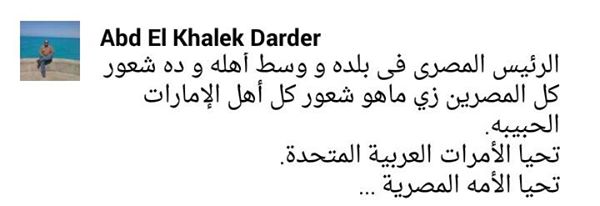 فقال عبده دردير: “الرئيس المصري في بلده ووسط أهله وده شعور كل المصريين زي ما هو شعور كل أهل الإمارات الحبيبة”.