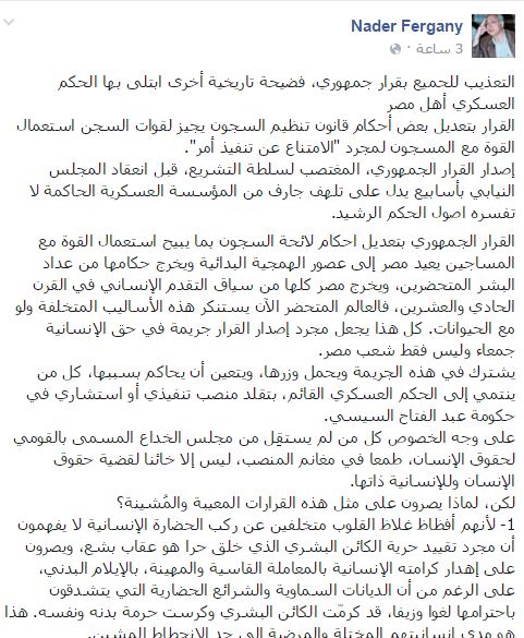2- “يظنون ربما أن وجود هذا القرار سيعفي زبانيتهم من وزارة القتل والتعذيب، الداخلية سابقًا، ولكنهم في جهلهم وغبائهم يخطئون جسيمًا، فالقرار باطل بطلانًا مطلقًا، حتى يُعدّ في نظر القانون السليم في حكم العدم لانتهاكه للدستور الساري وجميع المواثيق الدولية الخاصة بحقوق الإنسان وأصول القانون”.