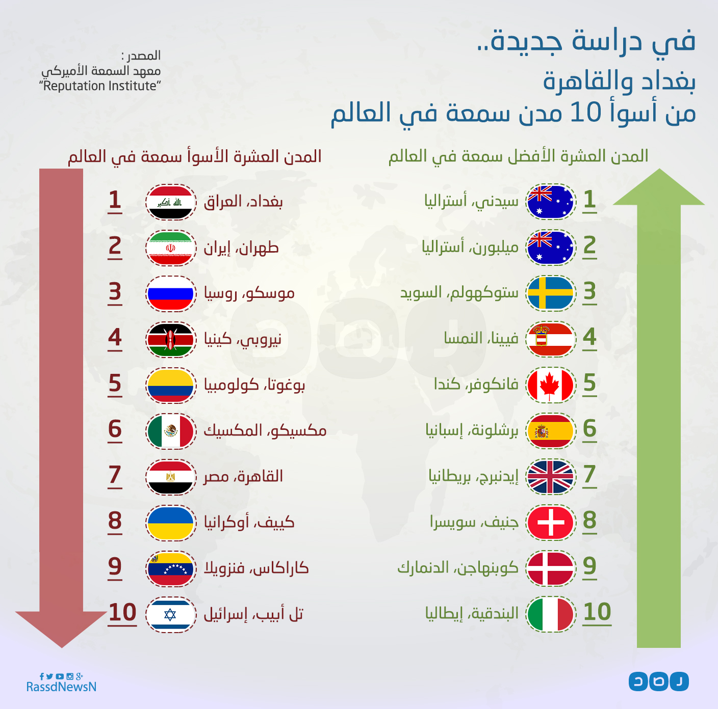 حصلت مدينة القاهرة على المركز السابع عالميًا ضمن قائمة المدن الأسوأ سمعة عالميًا، وجاءت بغداد في المركز الأول، وذلك في تقييم المدن الأحسن والأسوأ سمعة، وفقًا لدراسة من “معهد السمعة” “Reputation Institute” الأميركي.