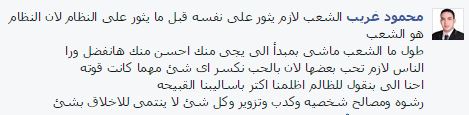 فيما رأى محمود غريب أن “الشعب لازم يثور على نفسه قبل ما يثور على النظام لأن النظام هو الشعب طول ما الشعب ماشي بمبدأ اللي يجي منك أحسن منك، هانفضل ورا الناس لازم تحب بعضها لإن بالحب نكسر اي شيء مهما كانت قوته، احنا اللي بنقول للظالم اظلمنا أكتر بأساليبنا القبيحة، رشوة ومصالح شخصيهة وكدب وتزوير وكل شيء لا ينتمي للأخلاق بشيء”.