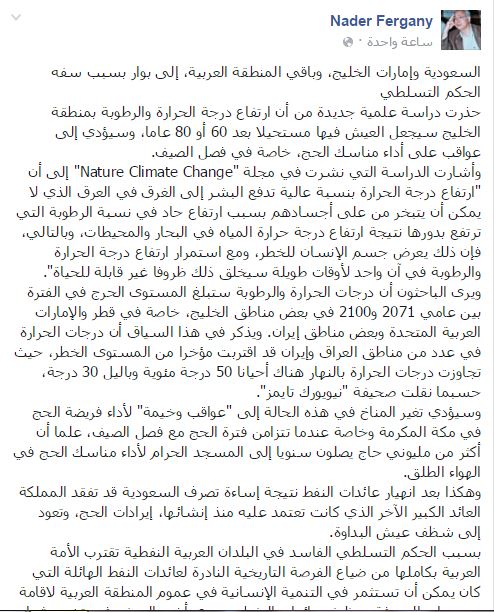 أشار نادر فرجاني، أستاذ العلوم السياسية بجامعة القاهرة، إلى دراسة علمية جديدة حذرت من أن ارتفاع درجة الحرارة والرطوبة بمنطقة الخليج سيجعل العيش فيها مستحيلًا بعد 60 أو 80 عامًا، وسيؤدي إلى عواقب على أداء مناسك الحج، خاصة في فصل الصيف.