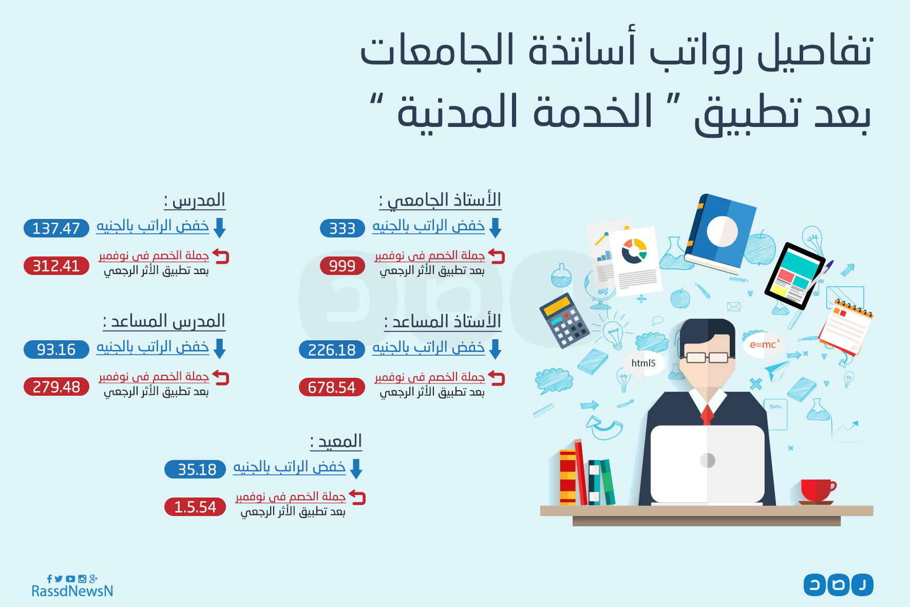 أما المدرس المساعد فينخفض راتبه 93.16 جنيه، وبتطبيق الأثر الرجعي يخصم 279.48 جنيه من شهر نوفمبر، وفيما يتعلق بالمعيد ينخفض راتبه نحو 35.18 جنيه، وبتطبيق الأثر الرجعي يخصم 105.54 جنيه من راتب نوفمبر.