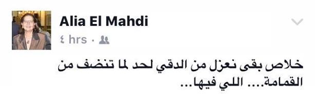 وأضافت في منشور آخر، خلاص بقى نعزل من الدقي لحد لما تنضف من القمامة اللي فيها.