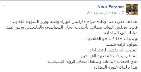 وقال الفقيه الدستوري، نور فرحات: “هذا ما حذرت منه وقلته صراحة لرئيس الوزراء وقتئذ ووزير الشؤون القانونية، قانون مجلس النواب سيأتي بأصحاب المال السياسي والفاسدين ورموز عهد مبارك إلى البرلمان، ويبدو أن هذا كان هو المقصود”.