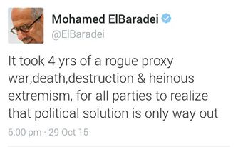 نشر الدكتور محمد البرادعي تدوينة جديدة على موقع التدوينات "تويتر"، وجه فيها كلماته نحو الأزمة السورية، حيث قال: "لقد استغرق الأمر 4 سنوات من الحرب والموت والدمار والتطرف، ليدرك جميع الأطراف أن الحل السياسي هو المخرج الوحيد".