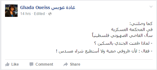 وقالت عويس في منشور لها على حسابها بموقع التواصل الاجتماعي “فيسبوك” : “في المحكمة العسكرية، سأل القاضي الصهيوني فلسطينيًا – لماذا طعنت الجندي بالسكين ؟ – فقال : لأن ظروفي صعبة ولا أستطيع شراء مسدس!”.