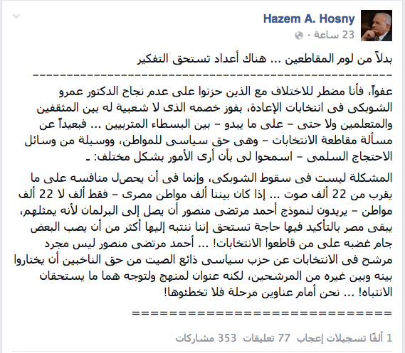 وأضاف حسني خلال منشور له على صفحته الشخصية على موقع التواصل الاجتماعي “فيس بوك” بعيداً عن مسألة مقاطعة الانتخابات – وهى حق سياسى للمواطن، ووسيلة من وسائل الاحتجاج السلمى – اسمحوا لى بأن أرى الأمور بشكل مختلف.