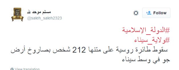 وعلق مسلم موحد لله: “سقوط طائرة روسية على متنها 212 شخص بصاروخ أرض جو في وسط سيناء”.