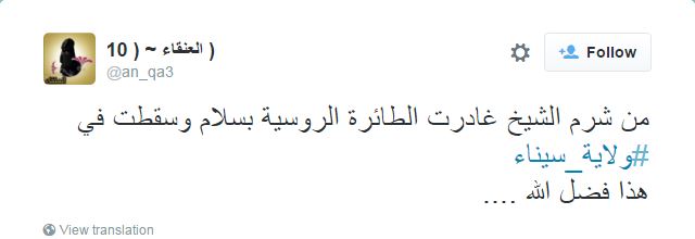 وقالت العنقاء: “من شرم الشيخ غادرت الطائرة الروسية بسلام وسقطت في #ولاية_سيناء هذا فضل الله…”.