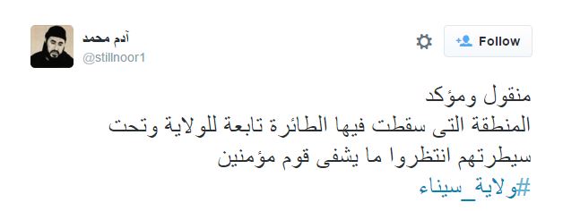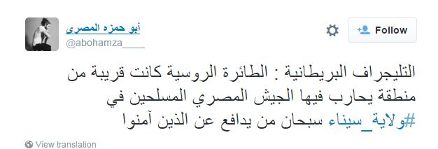 ونقل أبو حمزه المصري، عن “التليجراف” البريطانية قولها: “إن الطائرة الروسية كانت قريبة من منطقة يحارب فيها الجيش المصري المسلحين في #ولاية_سيناء”، مضيفًا “سبحان من يدافع عن الذين آمنوا”.