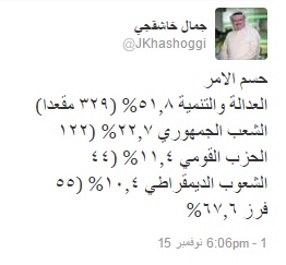 أكد الكاتب السعودي البارز جمال خاشقجي الأخبار المتداولة بشأن النسبة التي حاز عليها حزب العدالة والتنمية التركي الحاكم في الانتخابات التي تُجرى اليوم، مشيرًا إلى أن الأمر قد حسم للحزب بنسبة 51,8%.